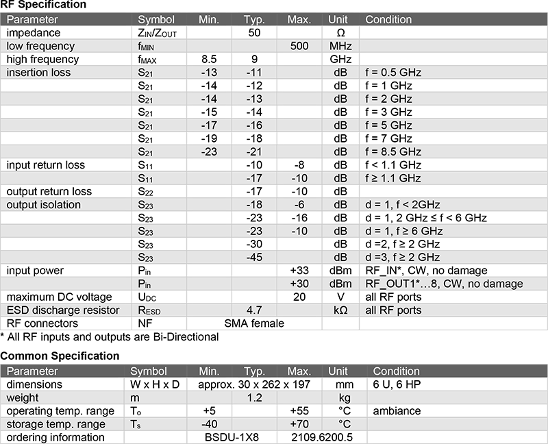 BSDU-1X8 為一款寬頻雙向射頻合路/分配器(Bidirectional Splitter/Combiner)模組,可將來自單一共用埠的射頻訊號分配或合路至 8 個等效輸出埠,涵蓋頻率範圍自 500 MHz 至超過 9 GHz,完整支援最新 Wi-Fi(如 IEEE 802.11ax)與行動通訊技術(如 5G NR mmWave)所使用的頻段。