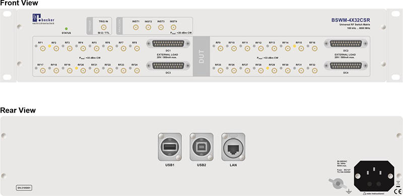 該機種採用 標準 19 吋、2U 機箱結構,並提供 可調式前/後掛耳設計,可靈活安裝於不同深度的機架中,支援 ½ 19 吋間距微調(約 15 cm),有助於最佳化機箱位置與布線;所有 RF 埠與 Trigger 輸入埠皆位於前面板,便於與量測設備以短纜線快速連接。
