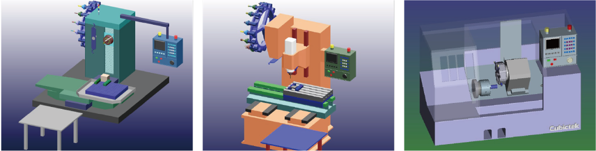 SANLAB CNC 模擬器中的多種機台模型:左至右依序為:立式銑床、立式加工中心、CNC 車床,三種虛擬機台皆具備可互動控制介面與可切換刀具模組,支援多樣化加工模擬與訓練應用。