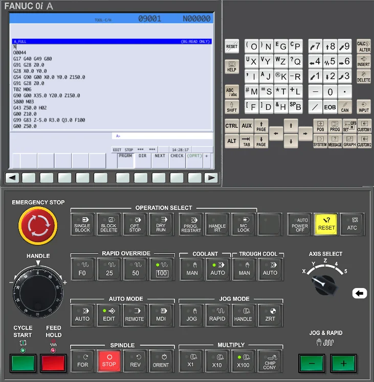 FANUC 0i-A 系列 CNC 控制器操作介面:具備 G-Code 程式顯示區、軸向選擇器、手輪操作、冷卻控制、急停鈕等功能;模擬器完整還原實機介面,支援多種模式操作(自動、自走、手動、程式編輯等),可訓練學員熟悉實際加工流程與操作邏輯。