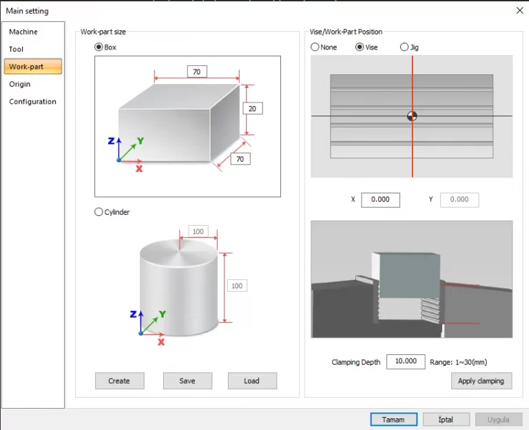 工件設定包含:尺寸、虎鉗(vise)、座標等參數。設定介面包括視圖、座標欄位,以及「套用夾持」(Apply Clamping)按鈕;可定義工件尺寸、形狀與夾持位置,以達成精確模擬。