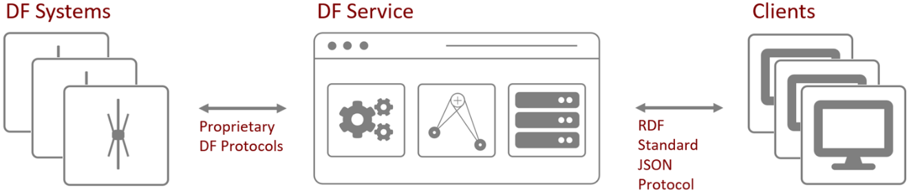 透過使用標準化的測向儀通訊協定,其格式採用 JSON(JavaScript Object Notation),使得進一步的通訊協定轉換,例如:將測向資料轉換為 ASTERIX 格式,能夠非常輕鬆地實現;此外,透過此介面,也可連接其他服務,例如:資料紀錄與監控服務;因此,DF Commander MK2 控制與監控軟體可被視為一個服務模組,能夠簡便地整合測向儀系統至現代 VTS(Vessel Traffic Services,船舶交通服務)與 ATC(Air Traffic Control,航空交通管制)網路架構中。