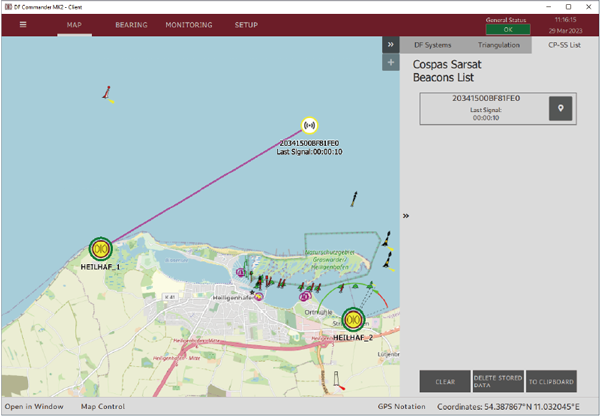 COSPAS-SARSAT 解碼:解碼測向儀系統訊號,並顯示通往 COSPAS-SARSAT 求救發報器(CP-SS Beacon)的方位線(Bearing Line)