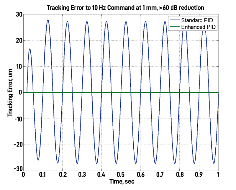透過諧波消除 (Harmonic Cancellation) 功能,可顯著改善系統追蹤效能,在 10 Hz 的運動指令下,相較於標準 PID 控制器(藍線)所產生的大幅追蹤誤差,啟用 DCT 後的增強型 PID(綠線)能將誤差抑制至趨近於零,實現 >60 dB 的效能提升。