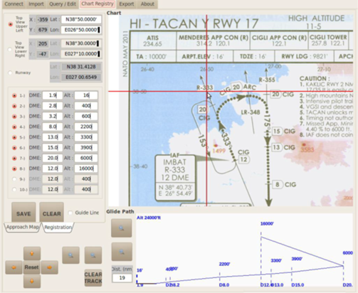 ![]() 圖中顯示 HI-TACAN RWY 17 高高度進場圖 (High Altitude TACAN Approach for Runway 17),即高高度 TACAN 進場程序(Tactical Air Navigation),用於跑道 17 的進場引導;包含飛行程序、導航點(DME)、高度限制及進場滑降道(Glide Path);左側為飛行數據輸入面板,可調整 DME 與高度資訊,並顯示滑降剖面圖;右側顯示航圖,標示 TACAN 進場路徑、轉彎點(ARC)、IAF(Initial Approach Fix)IMBAT 及 CIGLI 塔台資訊,並附加高度與進場警告訊息。 |