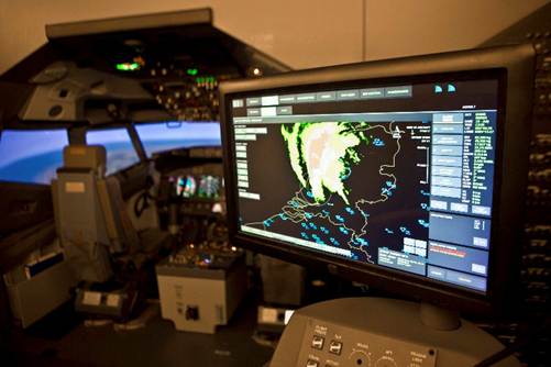 ![]() 圖中為飛行模擬訓練環境,其中包含固定翼飛行模擬器(Fixed Wing Flight Simulator)和顯示即時天氣資料與航路資訊的監控螢幕;螢幕上可見天氣雷達系統(Weather Radar System),顯示風暴雲層覆蓋範圍,以及周邊航點與導航訊息;右側的控制面板提供詳細的飛行數據,包括飛機座標、風速、溫度、高度與航向,讓飛行員能夠在不同氣象條件下訓練應變能力。 |