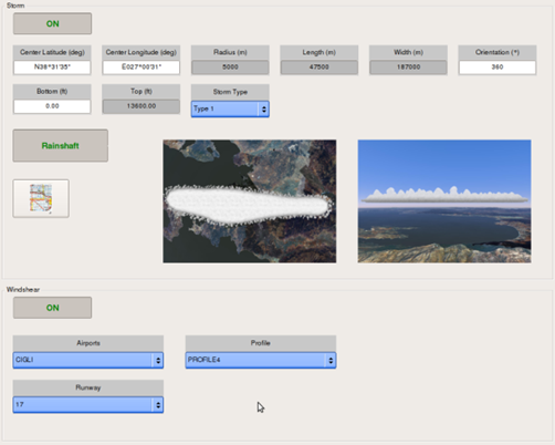 ![]() 此畫面展示了飛行模擬器的氣象伺服器(Weather Server),用於模擬真實的天氣環境,幫助飛行員在不同氣象條件下進行訓練;在畫面的上半部分,暴風模擬(Storm)功能已開啟,設定了一個覆蓋廣泛的風暴區域,暴風的中心位置以經緯度座標(N38°31'35"、E027°00'31")標示,範圍涵蓋半徑 5,000 公尺,長度 47,500 公尺,寬度 187,000 公尺,高度從地表(0 英尺)延伸至 13,600 英尺;系統選擇了風暴類型 1(Storm Type 1),並透過圖像顯示降水區域(Rainshaft),可見風暴覆蓋的區域及其影響範圍,這種模擬能夠重現飛行中的惡劣天氣,例如雷暴、強降雨和低能見度,讓飛行員學習應對策略。 |