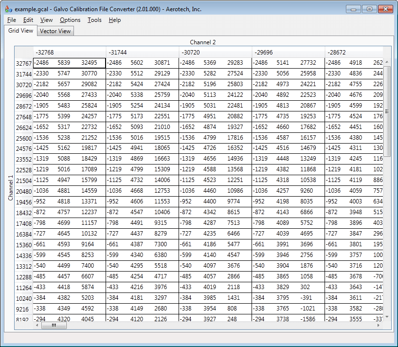 Aerotech GalvoCFC 軟體的格線檢視(Grid View)模式,以表格形式呈現振鏡掃描器在 Channel 2 軸向的原始校準數據點,此介面讓使用者能直接檢視或手動修改特定座標位置的精確補償數值,以進行細部校準。