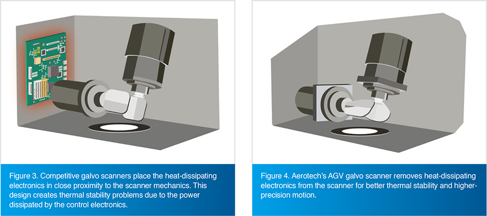 GL4 採用線性放大器驅動,此為驅動振鏡掃描頭馬達最穩定且高效能的方式,可提供更佳的速度控制與定位穩定性,此設計將放大器與伺服驅動元件整合於 GL4 的機箱中,並刻意與振鏡掃描頭(例如 AGV-HP(O))分離,目的是為了最小化熱雜訊與漂移,同時減輕掃描頭的質量與縮小其體積,將熱源從掃描器中移除可有效提升系統精度(如圖 3 和圖 4 所示),最大化其效能與精密度,這也正是Aerotech的掃描器解決方案與眾不同之處。