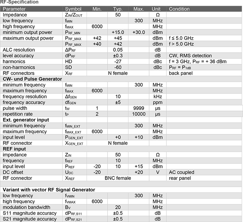 - 內建高穩定性 CW 射頻訊號源,可單機產生射頻訊號