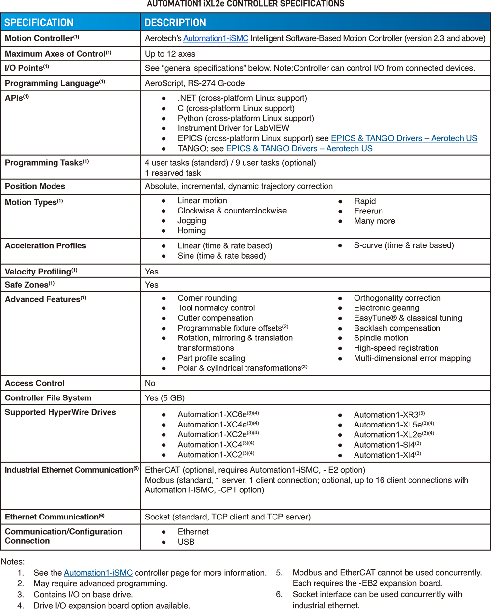 iXL2e 的性能表現優於市面上其他的線性放大器產品,此外,此機種更具備 Aerotech 運動控制器的完整功能,當 Automation1-iSMC 運動控制器部署於 iXL2e 驅動器時,可透過 Automation1 HyperWire 通訊匯流排控制多達 12 個運動軸,藉由 EtherCAT、Modbus TCP 與 Socket 介面,此裝置能實現真正的整機與運動系統全面控制,所有軸向皆與網路上其他軸向緊密協調,以提供輪廓運動控制並建構單一、簡潔的機台控制架構。