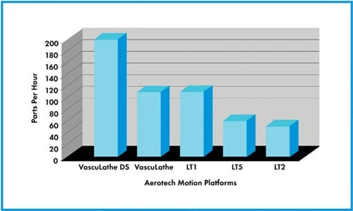 圖中為不同 Aerotech 運動平台的每小時加工零件數比較圖;VascuLathe DS 具有最高生產率,每小時可處理約 200 個零件,其次是 VascuLathe 和 LT1,而 LT5 和 LT2 則相對較低,顯示出不同平台在生產效率上的顯著差異。