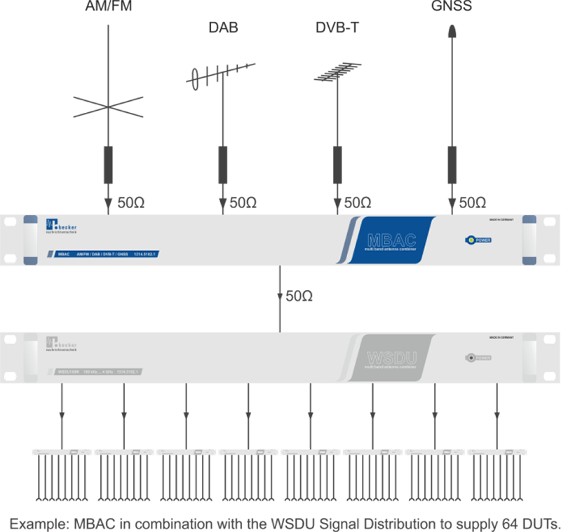 Becker 提供 FDMX 系列 頻率解多工器,具備 Fakra 連接器與多種 DC 負載選項,包含固定負載與可程式化電流吸收功能,適用於 DUT 虛擬供電測試。