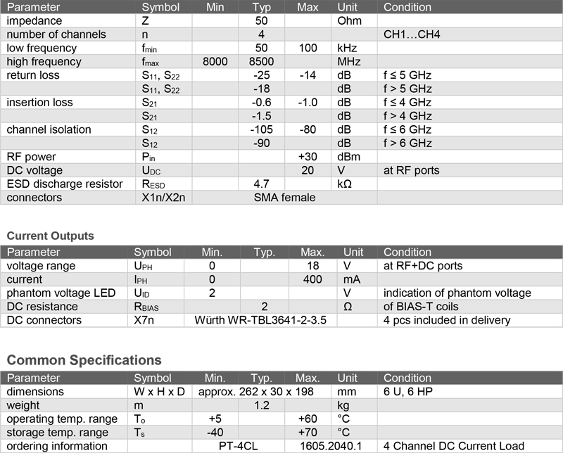 PT-4CL 為專為資訊娛樂元件虛擬電源(Phantom Supply)測試所設計之 高頻寬直流負載模組,具備插槽式模組(Slot-in Module)架構,可無縫整合至 SR6-11C 系統平台中,支援與其他射頻模組平行應用,建構彈性化測試架構;此模組提供 四個獨立射頻通道,每一通道皆內建 超寬頻 BIAS-T(超寬頻偏壓注入器),具備 直流負載電流高達 400 mA 的處理能力,適用於高耗電特性元件之驗證需求。前面板設有 LED 光學指示燈,可即時顯示各通道是否具備虛擬電壓,提升操作便利性與測試安全性;此模組結構堅固、設計緊湊,特別適用於實驗室研發、產線驗證與多模組量測系統環境。