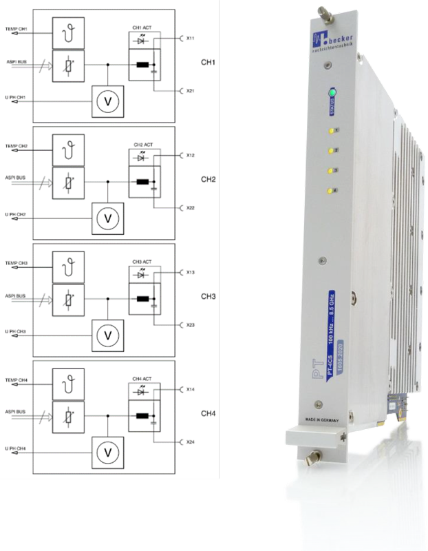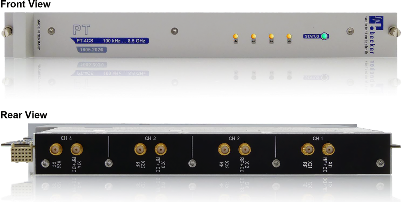 PT-4CS 可程式化直流負載模組為一款 4 通道插槽式模組,設計用於模擬主動式天線在不同載波環境下的電流負載需求;支援 100 kHz 至 8500 MHz 的廣泛頻率範圍,涵蓋 AM/FM 廣播、DAB、DVB-T、GNSS 及行動通訊等常見標準。每一通道可單獨設定直流電流負載,調整範圍為 0~400 mA,步進精度達 0.5 mA,滿足高解析度測試需求;另搭載內建電壓表,可同步量測每一路虛擬(phantom)電源供電電壓,有助於驗證系統穩定性與電源一致性。