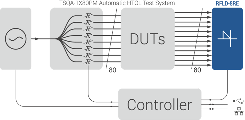 在進行 高溫操作壽命測試(High Temperature Operating Lifetime, HTOL) 的射頻測試系統中,RFLD-8RE 可在多通道架構下自動量測待測物之輸出功率變化,即使長時間運行亦具備穩定性與一致性,大幅節省測試階段的時間與人力成本,是 HTOL 大型應用場域中的關鍵量測模組。