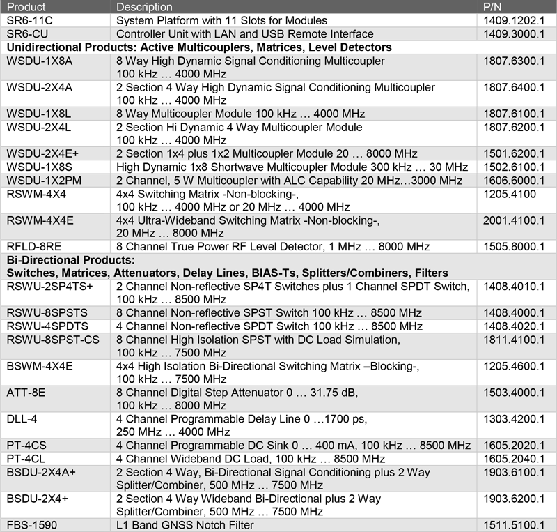 RSWM-4X4E 模組設計可無縫整合至 SR6-11C 系統平台中,該平台提供 11 組可擴充模組插槽,可搭配各類射頻模組,如射頻切換器、切換矩陣、多工器、衰減器、偏壓注入器(BIAS-T)、電平偵測器、雙向合路器/分波器等,實現高彈性訊號處理與管理架構。
