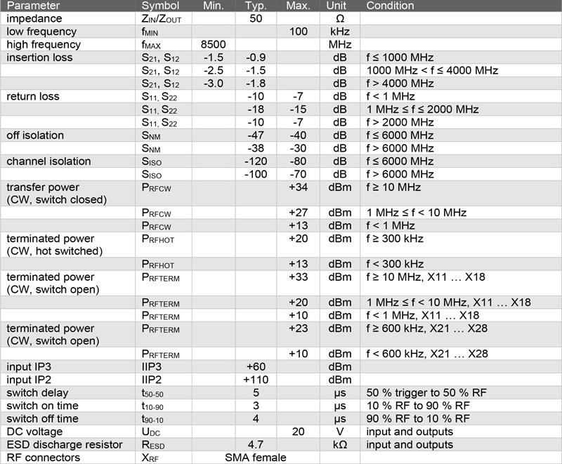 RSWU-8SPSTS 為一款高性能、具備八通道的 SPST 單刀單擲開關(SPST, Single Pole Single Throw),支援極寬頻率範圍自 100 kHz 至 8500 MHz,符合 50 歐姆系統架構,適用於多種射頻訊號切換應用;所有通道皆採用非反射型(Non-reflective)設計,即使在開路狀態下亦提供終端阻抗,能有效抑制訊號反射與多餘干擾,提升系統整體穩定性與訊號品質。