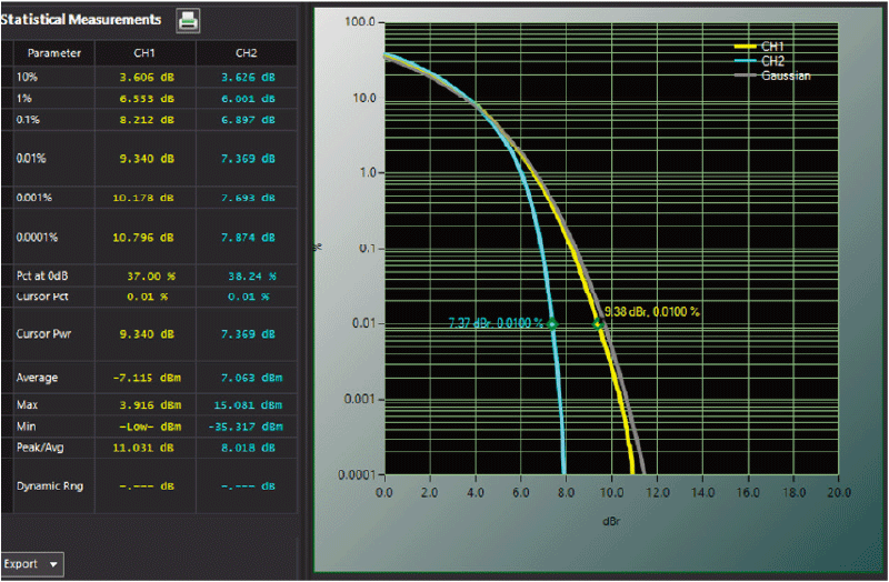 波峰因子(Crest Factor) 或 峰均比(Peak-to-Average Power Ratio) 是衡量被測設備(DUT)效能的關鍵指標,例如 放大器的線性度(Amplifier Linearity);透過 Boonton Power Analyzer 軟體,使用者可使用 CCDF(互補累積分佈函數) 來評估不同波峰因子值的機率,以深入了解設備效能。