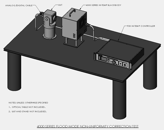 此圖展示 SBIR 4000 系列黑體應用於泛光模式非均勻性校正 (NUC) 測試的標準配置;在此配置中,4000 系列高溫黑體作為一個大面積、溫度均勻的輻射源,近距離直接照射安裝於支架上的待測物 (UUT)(例如:紅外焦平面陣列或熱像儀);930 高溫控制器負責精確設定與維持黑體所需的溫度條件,UUT 則透過類比/數位纜線將其響應訊號傳輸至後端分析系統,用於量測並計算校正值,以修正感測器各像元之間可能存在的響應不一致性。