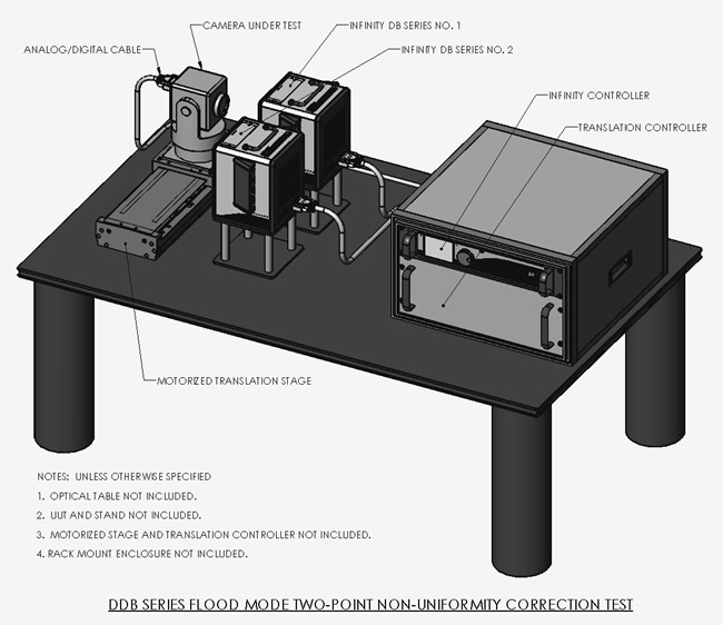 此圖展示了 DDB 系列泛光模式 (flood mode) 兩點非均勻性校正 (NUC) 的測試配置,設置中包含兩台 Infinity DB 系列黑體、一台安裝於電動位移平台上的待測相機,以及用於控制黑體與平台的 Infinity 控制器和位移控制器,此配置常用於校正紅外相機的像素響應差異。