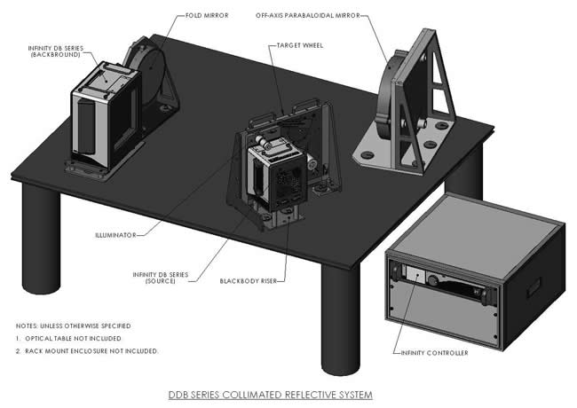 此圖為 DDB 系列準直反射系統配置,系統利用兩個 Infinity DB 黑體(背景源與目標源)、折疊鏡與離軸拋物面鏡產生準直紅外輻射,目標輪與照明器用於呈現測試目標,整體由 Infinity 控制器操作,常用於紅外感測器測試。