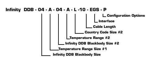 例如,一個雙頭 4 吋 Dual Infinity 系統,具有 IEEE 488 GPIB 通訊介面,115/60Hz 附美國電源線,兩個黑體的溫度範圍均為 0ºC 至 +100ºC 絕對溫度 T,電纜長度為 10 英尺,且兩個黑體上均有目標支撐板,其零件編號如下: