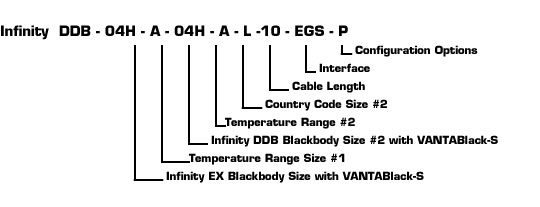 一個雙頭 4 吋 Dual Infinity 系統,具有 VANTABLACK® S-IR 高發射率塗層,IEEE 488 GPIB 通訊介面,115/60Hz 附美國電源線,兩個黑體的溫度範圍均為 0ºC 至 +100ºC 絕對溫度 T,電纜長度為 10 英尺,且兩個黑體上均有目標支撐板,其零件編號如下: