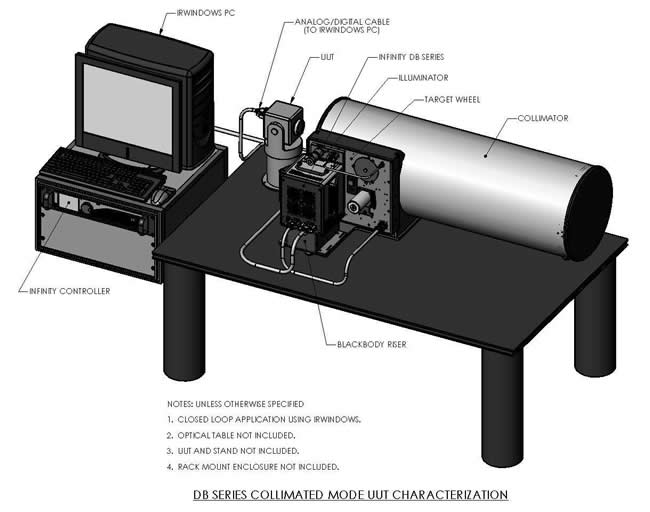 此圖展示 SBIR Infinity DB 系列黑體在準直模式下進行待測物 (UUT) 特性分析的配置,系統包含黑體、準直儀、目標輪、照明器及待測物,並透過 Infinity 控制器與執行 IRWindows 軟體的電腦形成閉迴路控制,實現自動化測試與資料分析。
