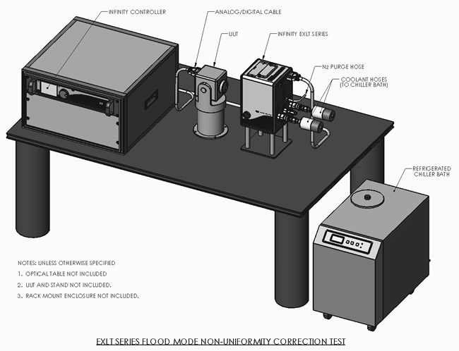 這張圖說明了使用 SBIR Infinity EXLT 低溫黑體進行待測物 (UUT) 泛光模式非均勻性校正的典型測試架構;配置中,左方的 Infinity 控制器負責整個系統的操作與控制,透過線纜連接至中間的待測物;Infinity EXLT 黑體源則放置在待測物前方,其均勻的低溫輻射面面向待測物;右側的冷卻水循環機透過冷卻管線為 EXLT 黑體提供必需的低溫冷卻液,使其能達到 -40°C 的工作溫度。同時,EXLT 黑體也連接了氮氣吹掃管線 (N2 Purge Hose),可用於防止水氣凝結。此設置能讓使用者精確評估或校正待測物在均勻低溫紅外背景下的成像均勻性與響應特性。
