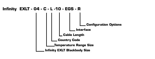 SBIR 的產品型號由六個欄位組成,代表客戶可選擇的不同配置,包括:黑體型號、黑體尺寸、溫度範圍、輸入電壓/電源線類型、線材長度、通訊介面及其他配置選項。
