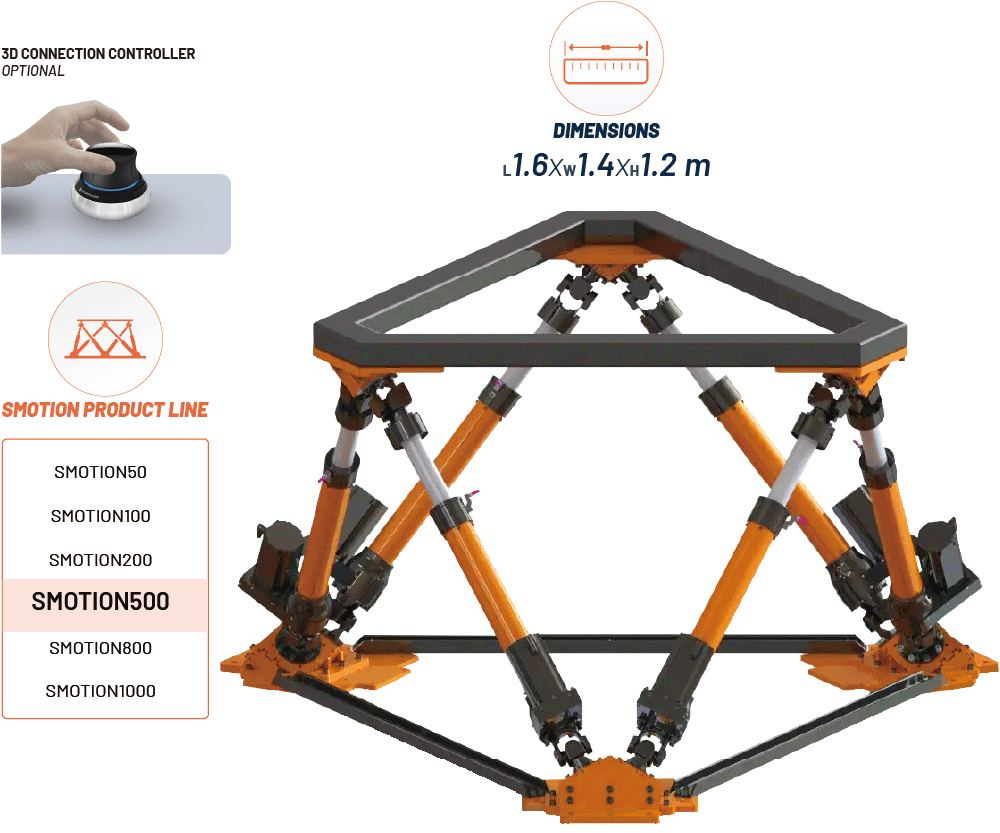 SMotion500 是一款最先進的 六自由度(6DOF) 運動平台,專為各種高科技應用提供精準的運動與控制,其強大的 負載能力 可達 500 公斤(kg),使其成為多種產業的靈活解決方案。