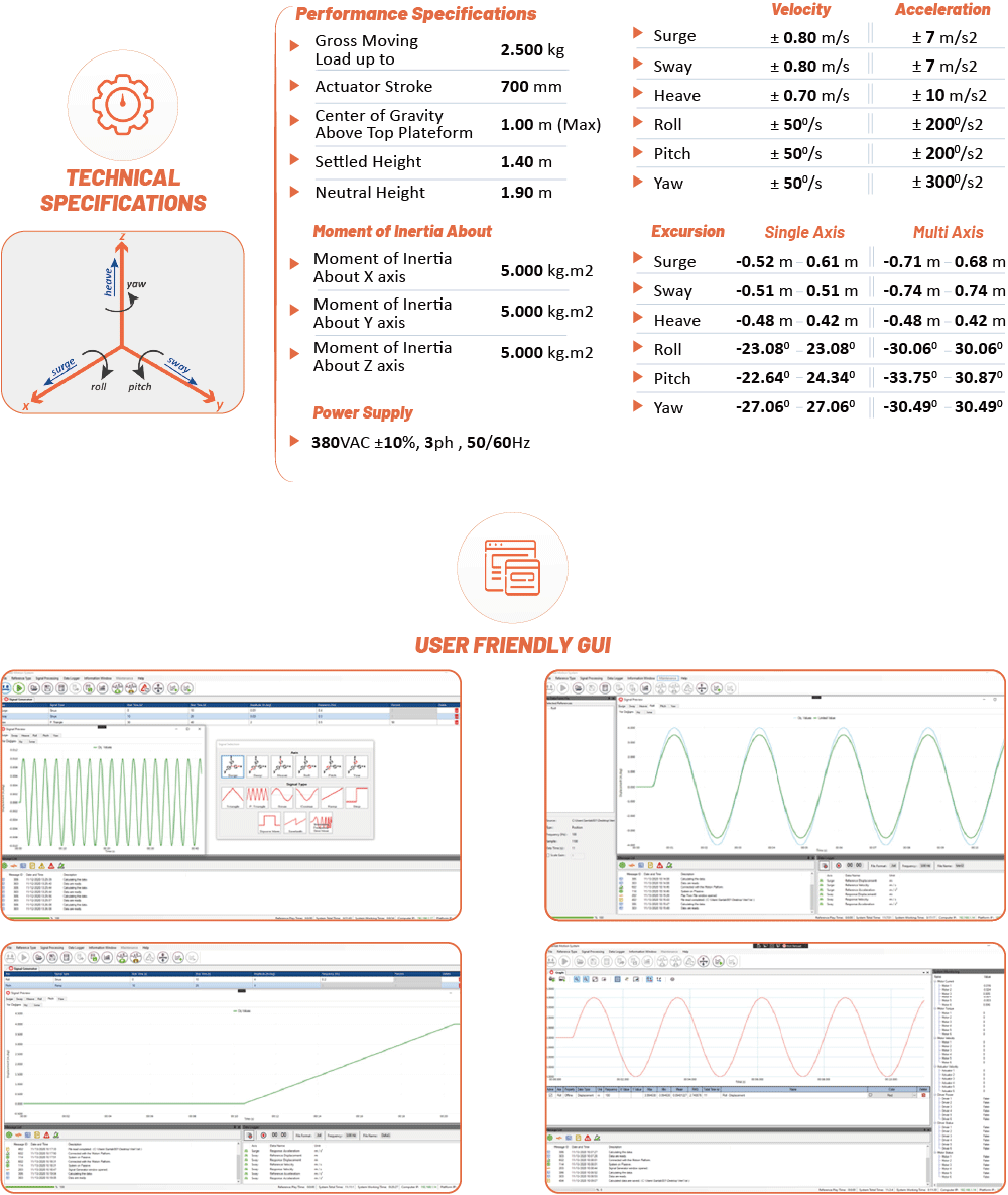- 與標準版相同的性能規格:保持標準版 SMotion2500 的所有運動特性,包括縱移 (Surge)、橫移 (Sway)、升降 (Heave)、滾轉 (Roll)、俯仰 (Pitch)、偏航 (Yaw) 的運動能力,以及加速度與轉動慣量。
