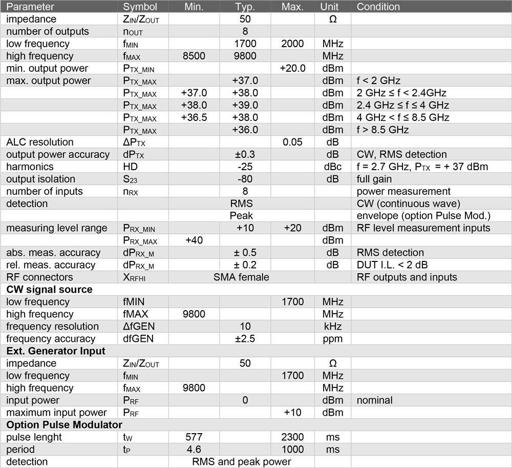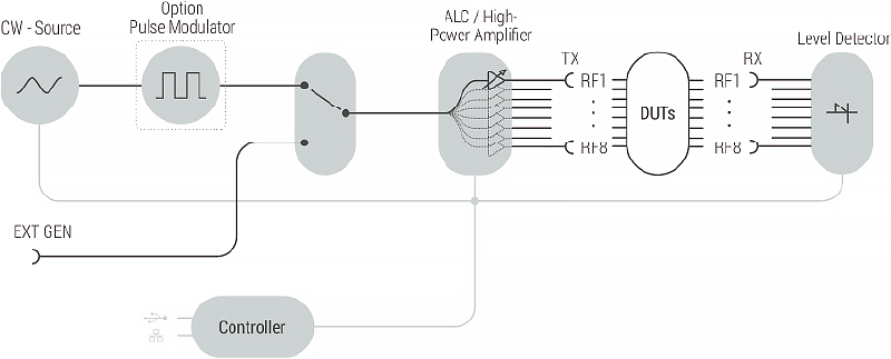 TSQA-1X8PMF 的輸出功率範圍廣泛,可涵蓋多種 DUT 分類,包括具增益的主動元件(如放大器),以及具有低插入損耗的被動元件(如濾波器)。