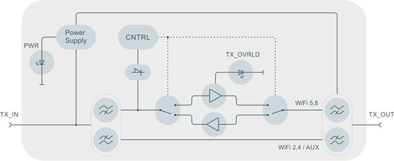 該機種整合兩組高性能射頻放大器電路,包括一組高線性度(High Linearity)發送功率放大器(TX Amplifier)與一組低雜訊接收放大器(LNA);預設狀態下,內部 TX/RX 開關設為接收模式(LNA 路徑),當偵測到主接點傳輸訊號時,內建高速輸入等級檢測器(High-Speed Input Level Detector)將自動觸發 TX/RX 開關切換至發送模式,進入功率放大狀態。