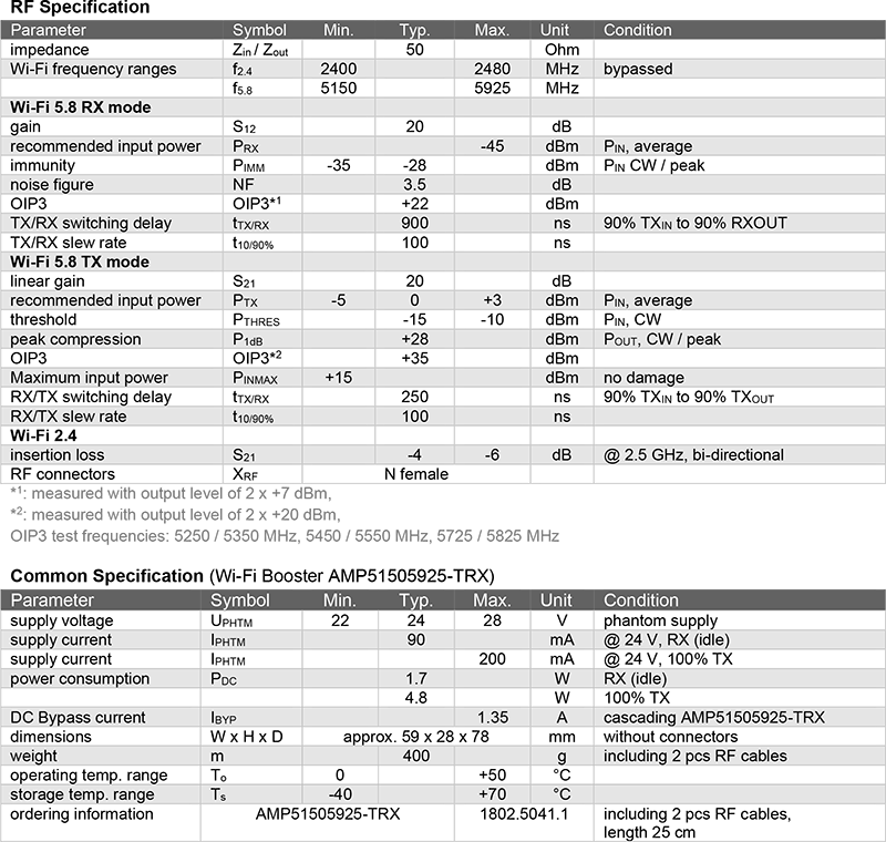 AMP51505925-TRX 為一款小型化、高動態範圍的 Wi-Fi 訊號發送與接收放大器模組,專為延伸隧道與建築物內無線電涵蓋範圍所設計。此模組適用於 5150~5925 MHz 頻段,支援 Wi-Fi 802.11 a/g/n/ac/ax 等多種標準協定,特別適用於5 GHz頻段無線通訊系統的涵蓋延伸與訊號補償應用。