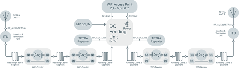 以下圖示為一組雙頻段、2×2 MIMO 的 Wi-Fi 無線接取點(AP)配置,該單一接取點可使涵蓋區域擴展超過 5 倍;此外,輻射電纜亦可用於 TETRA 系統訊號傳輸。