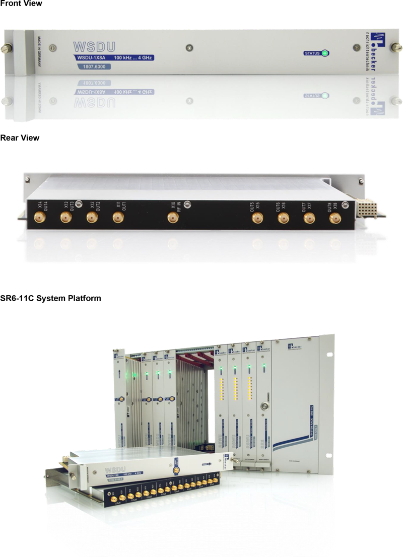 此模組(WSDU-1X8A)設計用於整合至 SR6-11C 系統平台中,SR6-11C 提供 11 個模組插槽,可配置多種功能模組,包括射頻開關(RF Switch)、矩陣模組、多工耦合器(Multicoupler)、衰減器、BIAS-T 電源注入模組、等級偵測器、以及用於訊號調整的雙向分波/合波器(Bi-directional Splitters/Combiners),並搭配控制模組進行集中管理。