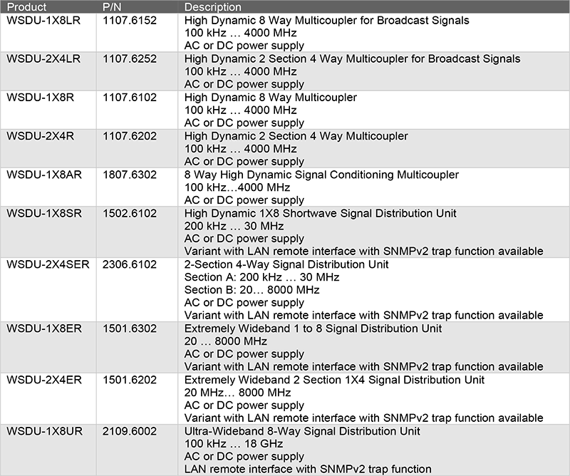此機種 WSDU-1X8ER 為專為大規模訊號分配系統所設計的射頻分配器,可將單一輸入訊號分配至八個輸出通道;其具備高動態範圍與極寬頻頻率支援能力,涵蓋 20 MHz 至 8000 MHz,亦提供支援LAN(乙太網路)與 USB 遠端監控功能之版本,適用於需進行集中監控或多點分配的系統架構;此外,其頻率範圍涵蓋最新無線通訊標準,包含 Wi-Fi 6E,可因應未來技術部署需求。