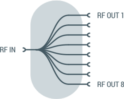 射頻(RF)輸入訊號透過一組寬頻低雜訊放大器進行放大處理,該放大器具備寬動態範圍,因此輸入訊號在分配至各輸出埠後,仍可提供約 3 dB 增益;RF 輸入與八組 RF 輸出皆採用 SMA 母接頭,並配置於模組後側。