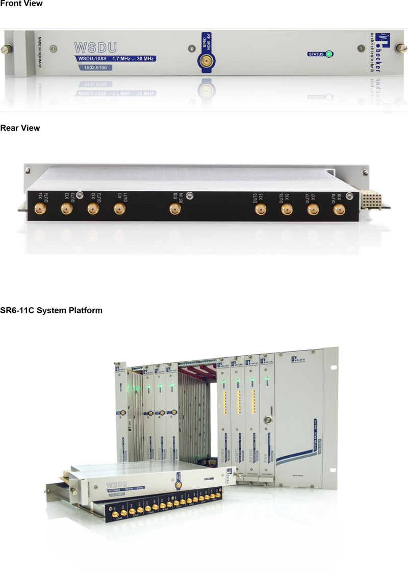 WSDU-1X8S 模組設計用於整合至 SR6-11C 系統平台中,SR6-11C 提供 11 個模組插槽,可容納射頻切換器(RF switches)、矩陣模組(matrices)、多工耦合器(multicouplers)、衰減器(attenuators)、BIAS-T、電平偵測器(level detectors)、雙向分配器/合波器(bi-directional splitters/combiners)等訊號調理模組與控制單元;若需啟用 WSDU-1X8S 的模組狀態監控功能,需搭配 SR6-CU 控制器單元使用。