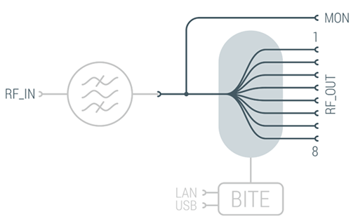 WSDU-1X8SR 可將一組輸入訊號 無損失(Lossless)地分配至 8 組等效輸出埠,並透過額外的 RF 監控埠進行不中斷的即時量測,所有射頻連接介面均採用 N 型母頭接頭。