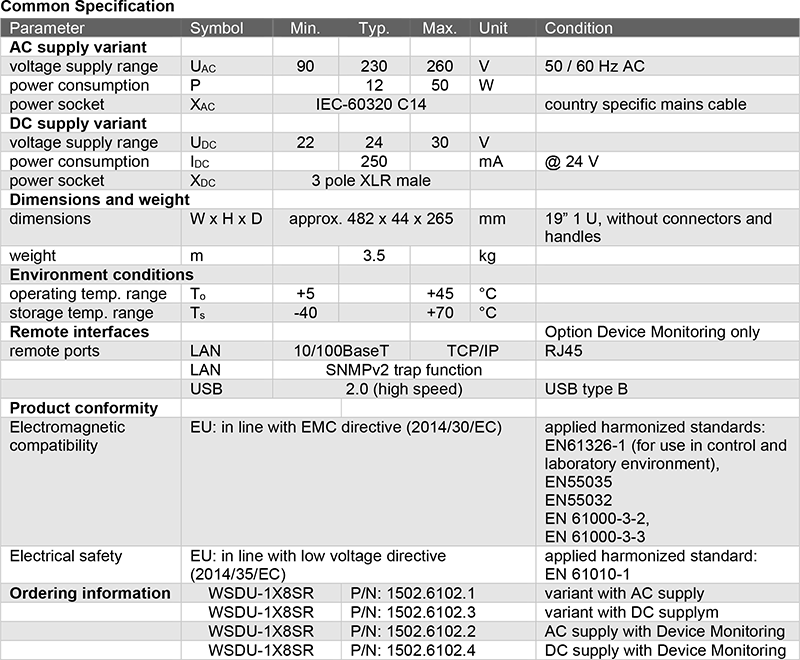 WSDU-1X8SR 標準內建 光學狀態指示燈,並可選配 遠端監控模組,提供 LAN 與 USB 存取介面。使用者可透過 ASCII 指令查詢以下資訊: