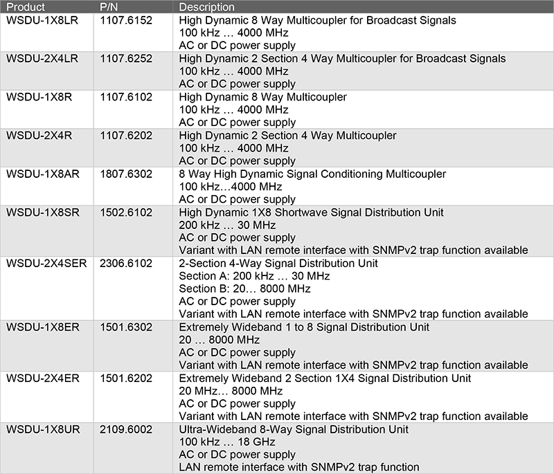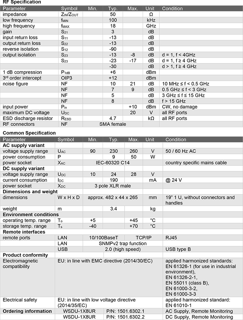 WSDU-1X8UR 為一款 超寬頻訊號分配器(Multicoupler),可將來自單一輸入埠的射頻訊號無損分配至 8 個獨立輸出埠,其頻率涵蓋範圍自 100 kHz 延伸至超過 18 GHz,具備極高應用彈性,涵蓋常見工業與終端設備所使用之頻段。