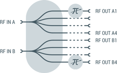 每一個輸出埠皆內建可程式化衰減器,支援最高 95.25 dB 的調整範圍,且每一通道皆可獨立設定,調整步進為 0.25 dB,提供精細電平控制能力。
