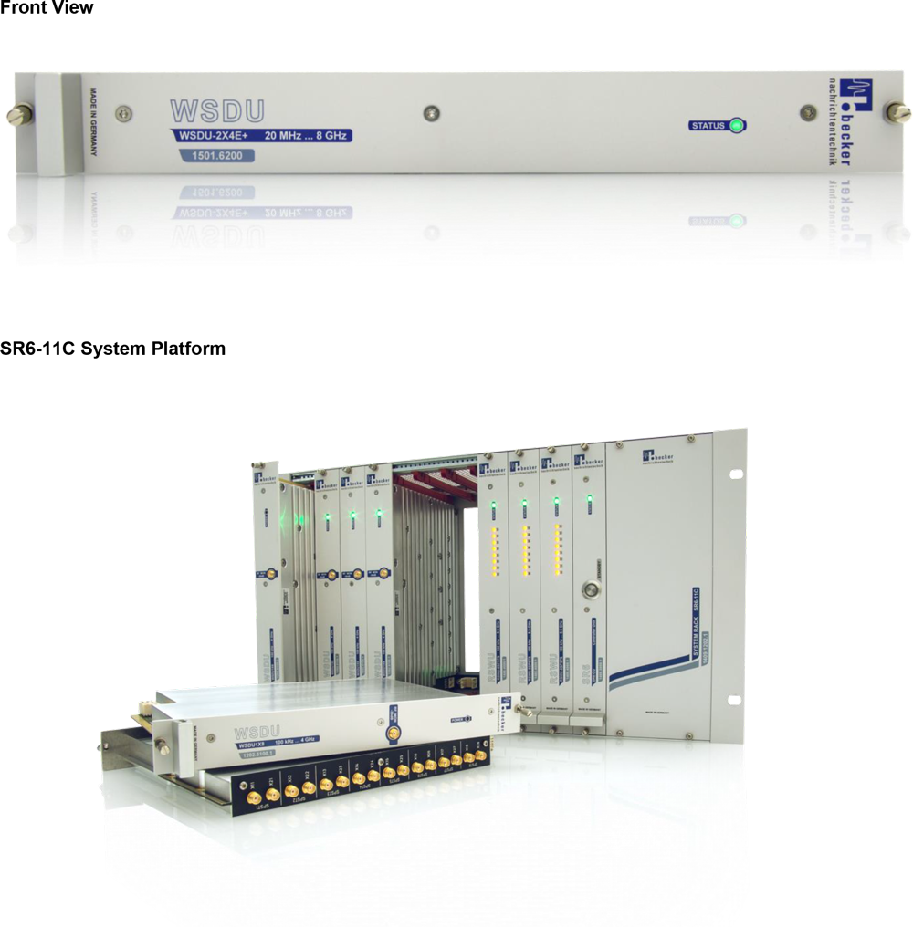 WSDU-2X4E+ 採插槽式設計,專為整合至 SR6-11C 機箱平台所設計;SR6-11C 共提供 11 個模組插槽,支援安裝如 RF 開關、矩陣模組、多工分配器、衰減器、BIAS-Ts、電平偵測器、雙向分配/合波器與控制模組等模組,用於訊號調理與監控任務;若需啟用 WSDU-2X4E+ 模組之遠端健康監控功能,須搭配 SR6-CU 控制器使用。