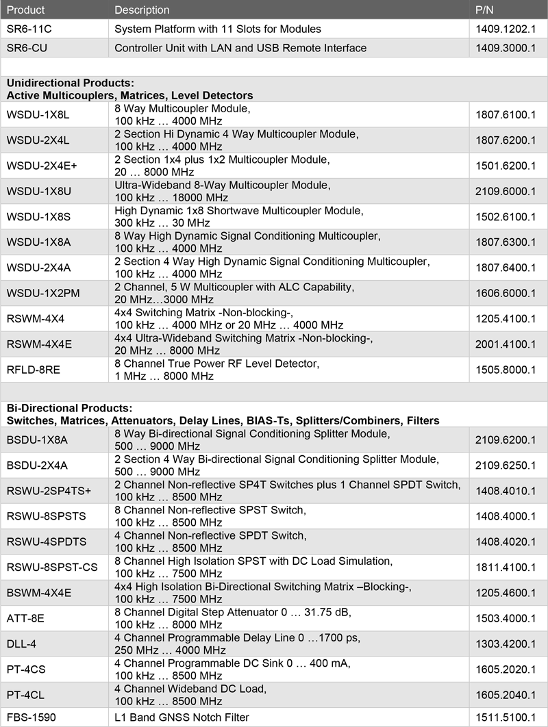 此模組支援極寬頻率範圍(20 MHz 至超過 8000 MHz),涵蓋 VHF、UHF 至 SHF 全頻段訊號,並具備高隔離度、高動態範圍與低雜訊增益等特性;模組採用插槽式設計,專為整合於 SR6-11C 系統平台打造,可與多種 RF 功能模組(如開關、衰減器、BIAS-T、控制單元等)共同部署,實現靈活擴展與集中式遠端管理,是建構高效穩定射頻分配架構的關鍵核心元件。