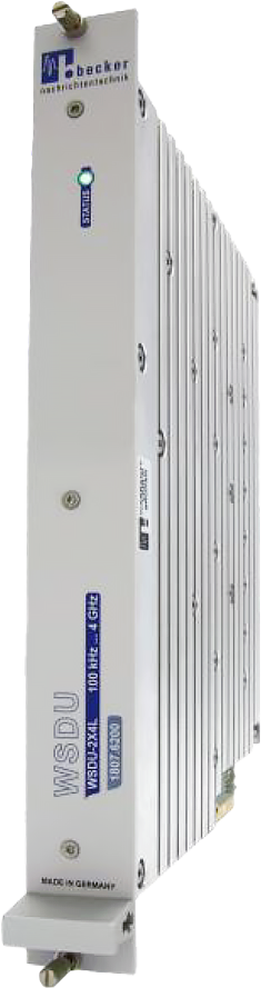 WSDU-2X4L 為一款高性能寬頻訊號分配單元,由兩個獨立的主動式多路耦合(Multicoupler)區段所構成,每個區段可將一組射頻(RF)訊號自單一輸入埠分配至四個輸出埠,具備低雜訊放大與高動態範圍特性,在全頻段內提供穩定且一致的訊號增益,確保關鍵通訊與導航應用中的量測準確度與重現性;模組支援 100 kHz 至超過 4000 MHz 的超寬頻率範圍,涵蓋 AM、FM、DAB、GNSS、DVB-T、SDARS 等應用頻段,適用性廣。