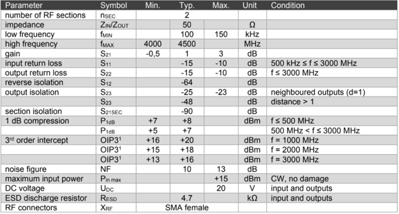 RF 輸入訊號透過寬頻低雜訊放大器進行放大處理,並具備高動態範圍;因此,分配後的每組輸出訊號可在各區段的四個輸出埠上提供約 1 dB 增益,RF 輸入與輸出皆配置於模組背板,並採用 SMA 母座連接器。